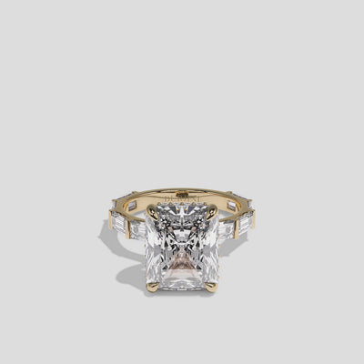 Alexandra Prestige, the exquisitely composed 8.00 carat total weight Diamond Radiant Halo Engagement Ring in 18K yellow gold, showcases the bold geometry and scintillating fire of its radiant-cut centre diamond. A radiant celebration of love and legacy, Alexandra Prestige blends refined lines with the warm richness of yellow gold, creating a regal engagement ring inspired by classic British royal elegance in the UK Whether worn alone as a confident statement or paired with a yellow gold wedding band, this design exudes golden brilliance and stately charm.
