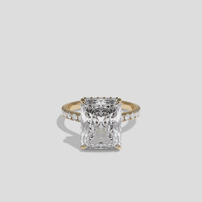 Aurora Evanesce, the exquisitely composed 8.00 carat total weight Diamond Radiant Halo Engagement Ring in 18K yellow gold, showcases the bold geometry and luminous fire of its radiant-cut centre diamond. A radiant celebration of love and legacy, Aurora Evanesce blends refined lines with the warm richness of yellow gold, creating a regal engagement ring inspired by classic British royal elegance in the UK. Whether worn alone as a confident statement or paired with a yellow gold wedding band, this ring exudes golden brilliance and stately charm.
