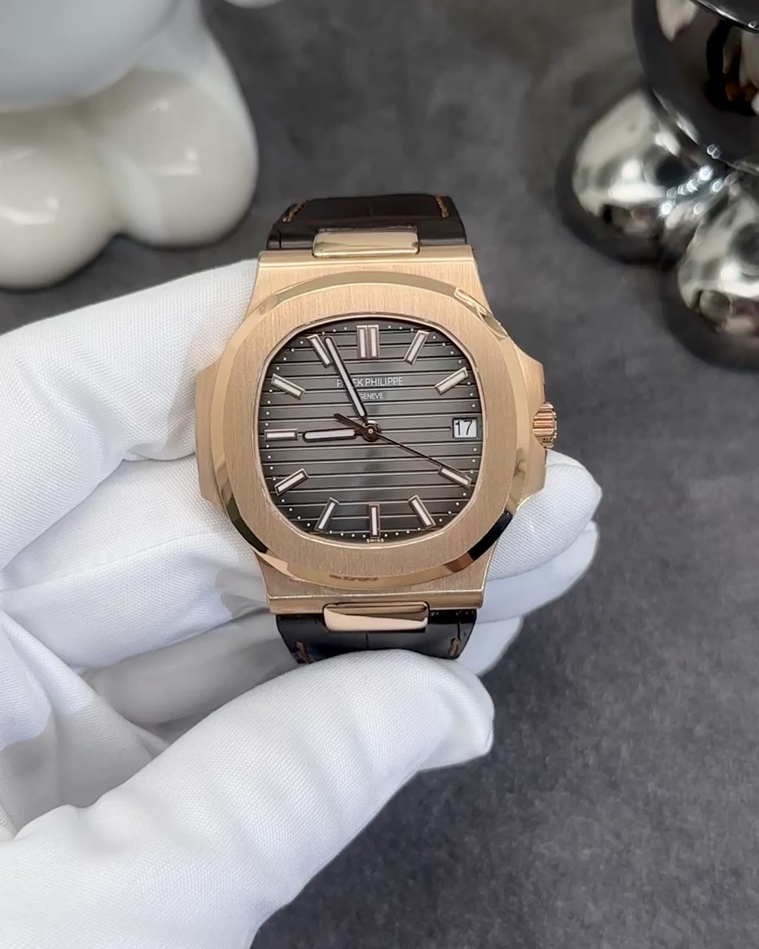 The Nautilus 5811/1G-001 is equipped with a dark brown alligator leather strap, which adds a touch of refined elegance to the sporty design. The alligator leather strap is supple and comfortable, designed to fit the wrist perfectly while maintaining a luxurious feel. The rich brown color of the leather complements the rose gold case, creating a striking contrast that enhances the watch’s overall aesthetic.