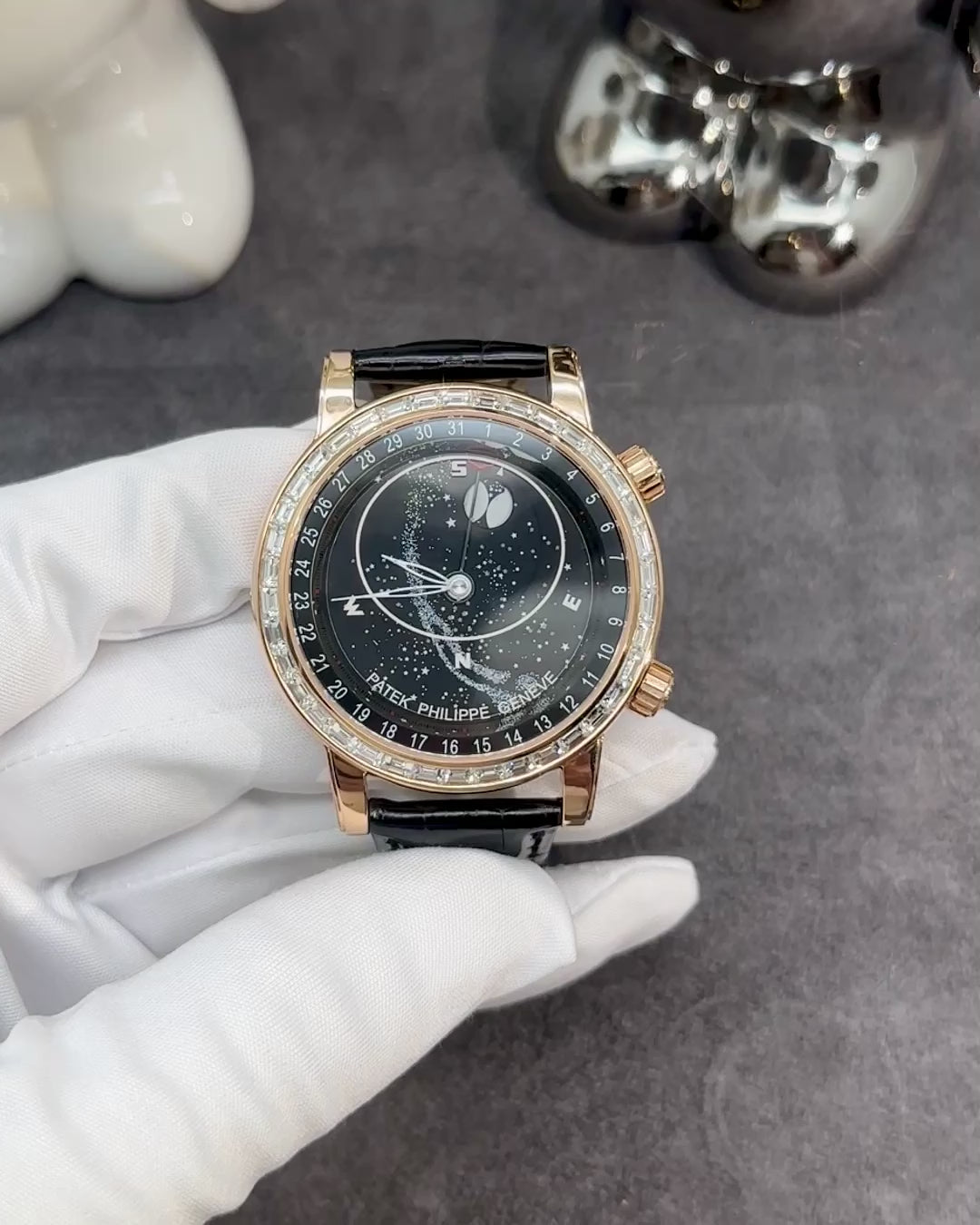✔ Dial: A stunning blue celestial display, showcasing a moving sky chart, moon phases, and the position of the stars as seen from Geneva