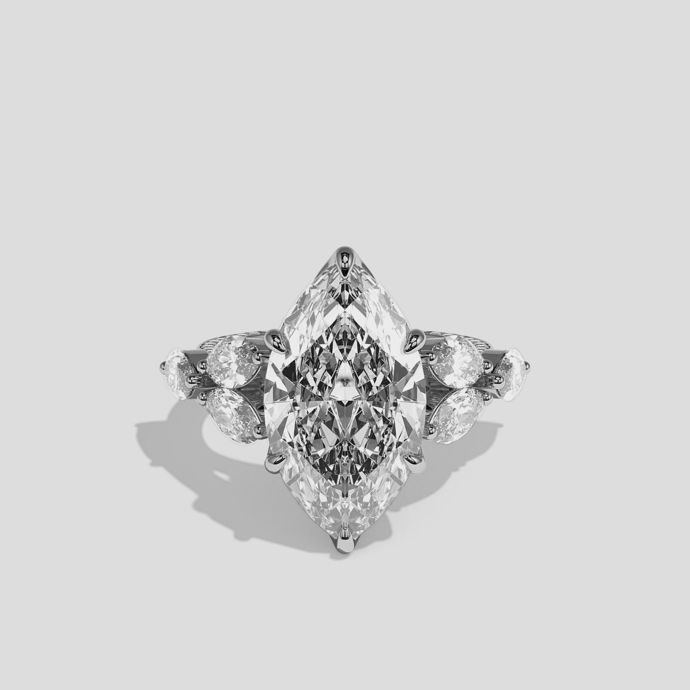 Seraphine Élan, the exquisitely composed 12.00 carat total weight Diamond Marquise Engagement Ring in 18K white gold, celebrates ethereal elegance and graceful elongation. Designed for those who adore romantic silhouettes with a touch of drama, this engagement ring showcases a marquise-cut centre diamond set in the cool, mirrored sheen of fine white gold. Whether worn alone or paired with slender diamond bands, Seraphine Élan offers a refined yet striking expression of contemporary romance.