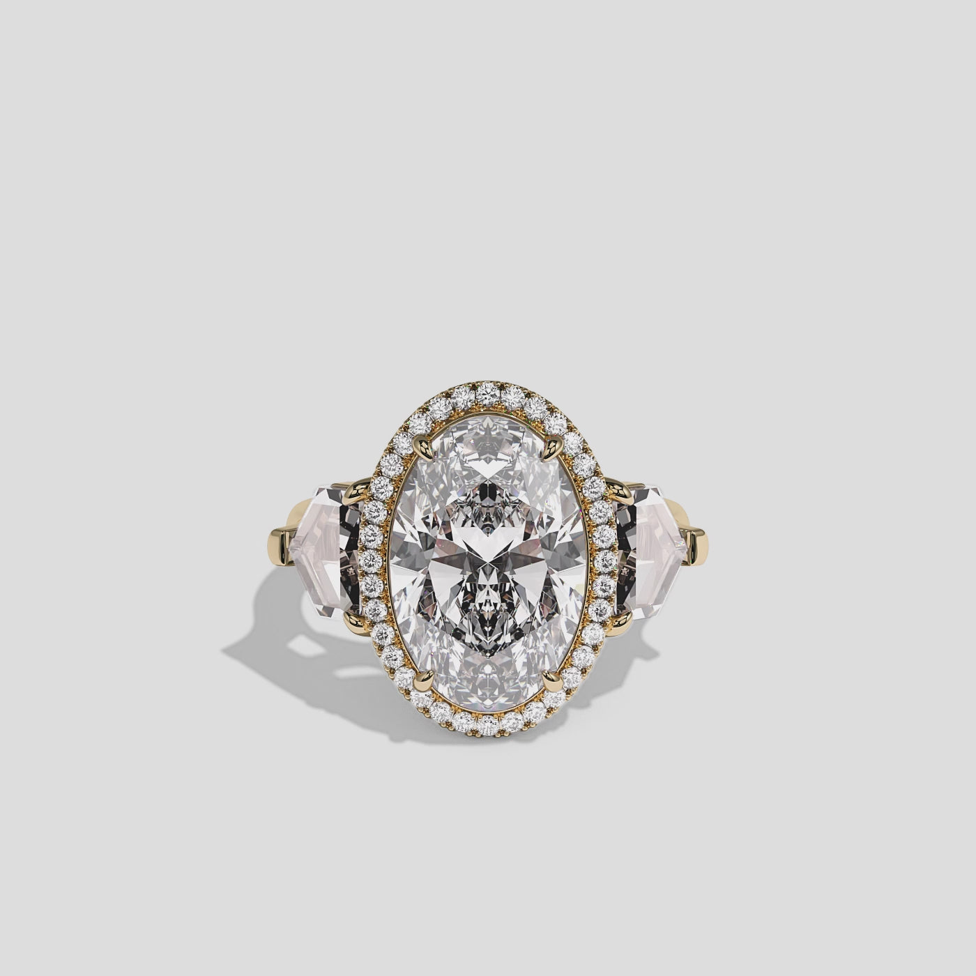 Vaudrieu Majesté, the exquisitely composed 15.00 carat total weight Diamond Oval Halo Engagement Ring in 18K yellow gold, showcases the romantic sweep and luminous fire of its oval-cut centre diamond. A radiant celebration of love and legacy, Vaudrieu Majesté blends graceful lines with the warm richness of yellow gold, creating an opulent engagement ring inspired by classic British royal elegance in the UK. Whether worn alone as a confident statement or paired with a yellow gold wedding band, this ring exudes golden brilliance and stately charm.